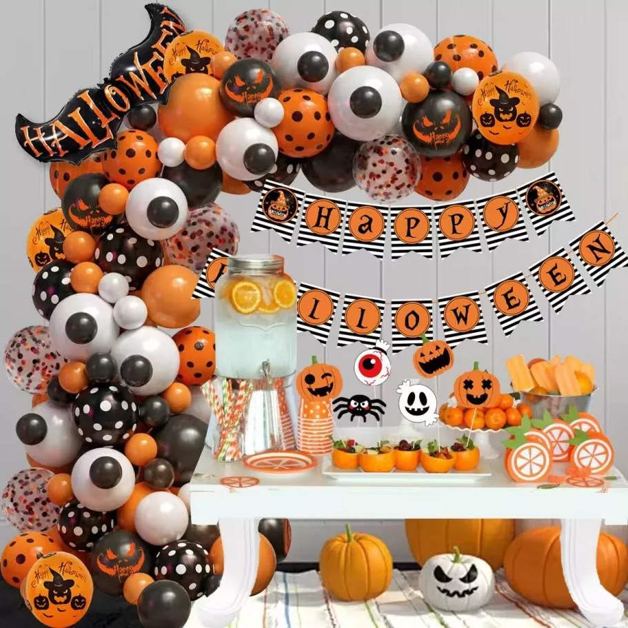 Des ensembles classiques d'orange et de couleur noire (tels que 120 sets, y compris des ballons de confettis et des ballons de film en aluminium Spider) peuvent rapidement construire un mur d'arrière-plan à thème;