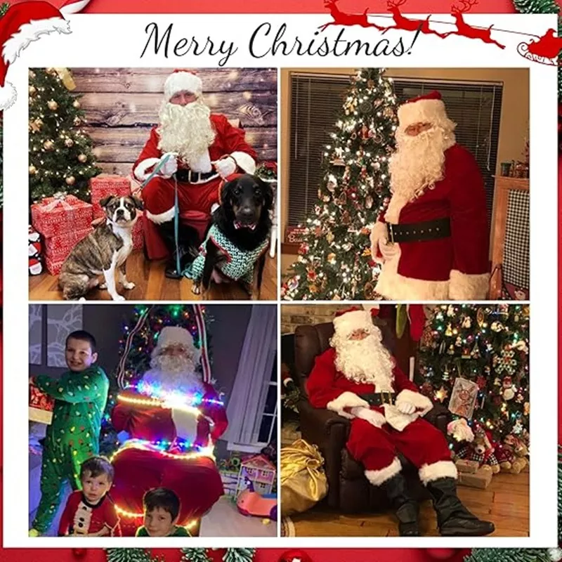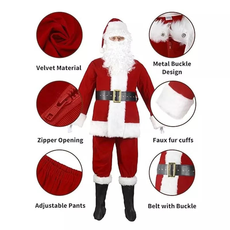 Ce costume du Père Noël est fabriqué à partir de tissu en polyester doux et confortable, offrant une excellente respirabilité et une chaleur, assurant de la chaleur et du confort pendant les activités hivernales. La conception du costume conserve la palette de couleurs rouge et blanche classique, accentuée par des ourlets blancs moelleux et une ceinture noire, créant un impact visuel frappant avec des détails complexes. Le costume est également livré avec un chapeau et une barbe assortis, ce qui le rend facile à porter sans accessoires supplémentaires.