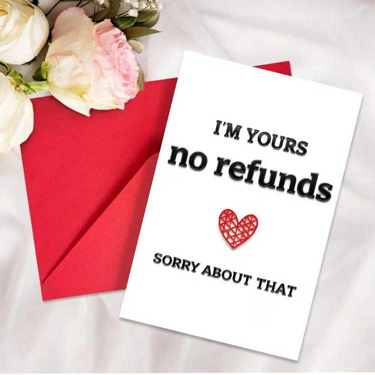 Il y a beaucoup d'espace vierge à l'intérieur pour des mots doux manuscrits, ou les clients peuvent choisir parmi nos lignes pré-imprimées.